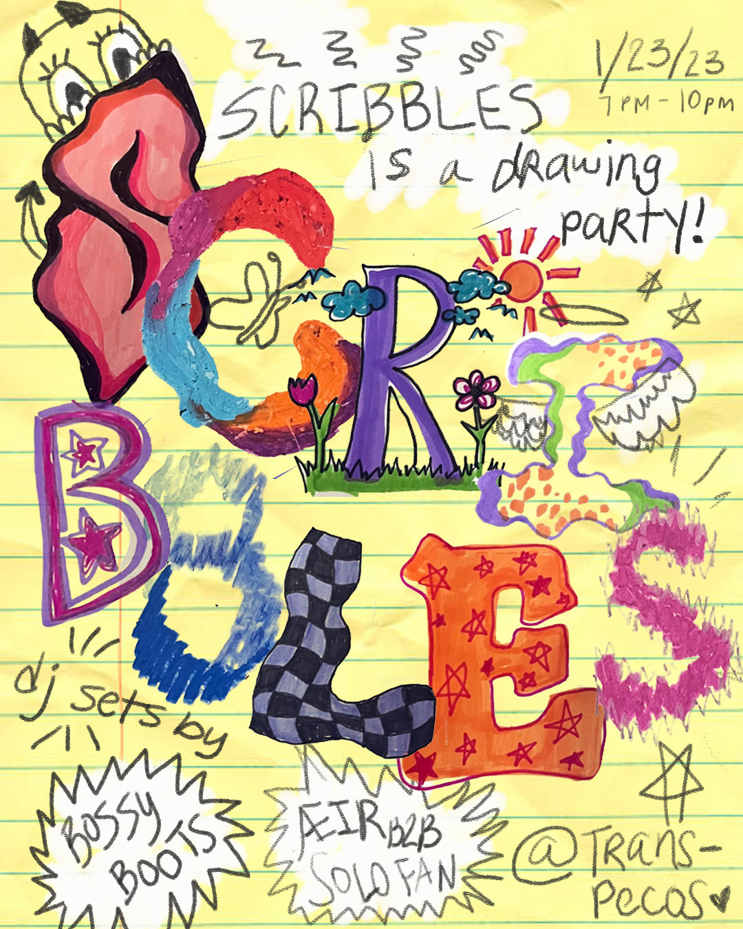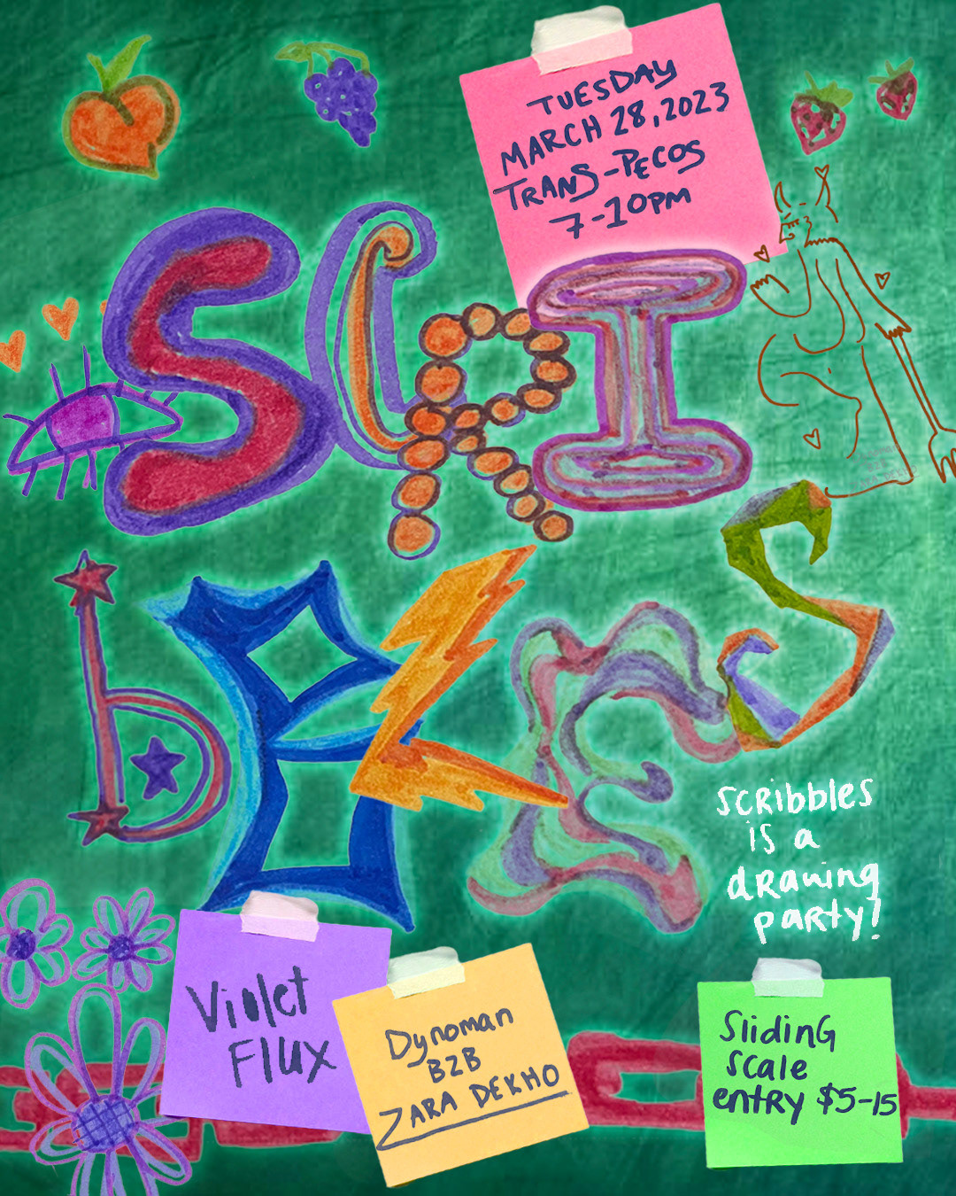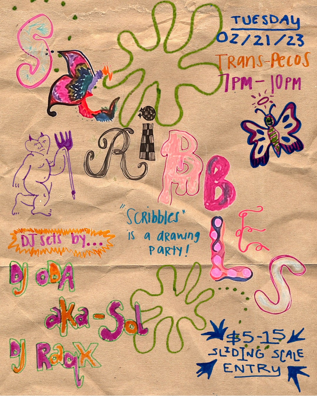 Scribbles is a drawing party I co-host with good friend and muse Taia Leituala, blending art-making with community and music in an open, playful atmosphere. Scribbles invites participants of all skill levels to explore self-expression through guided art prompts, shared materials, and a live soundtrack of wavy tunes. Each gathering becomes a collaborative space where everyone can let loose, connect with others, and celebrate the joy of making art together.