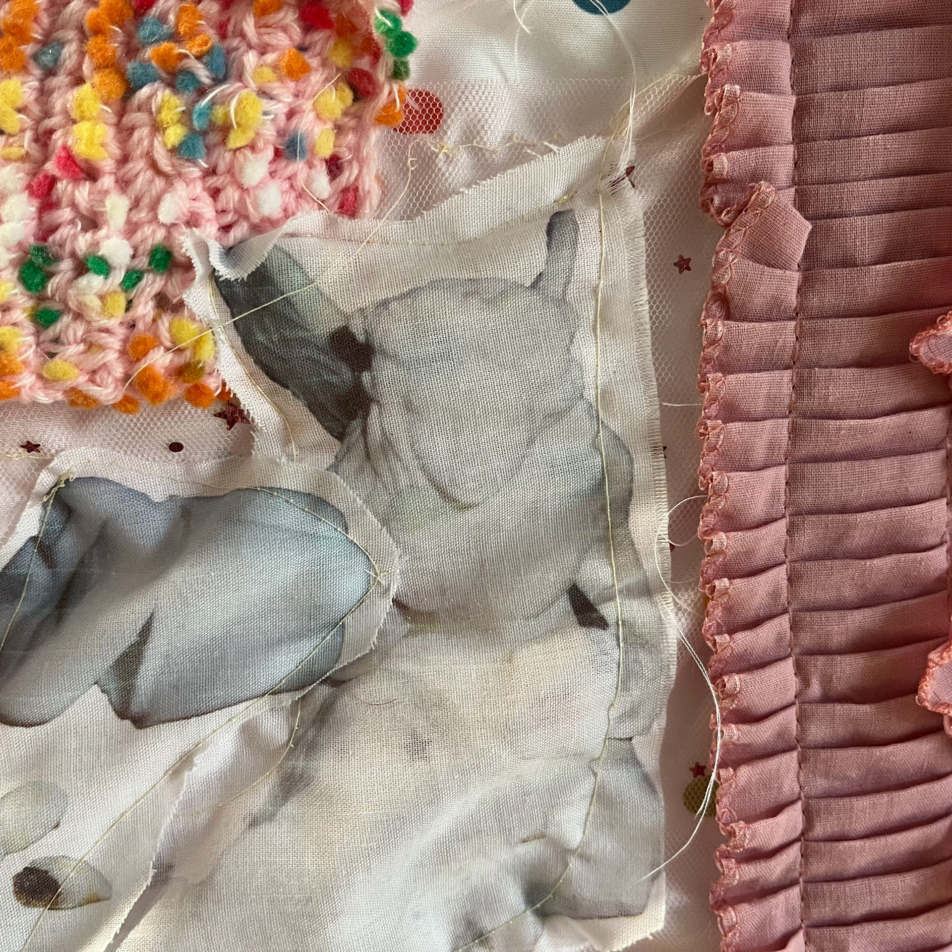 Recycled fabrics, ink jet prints on fabric, and sticks 2025.